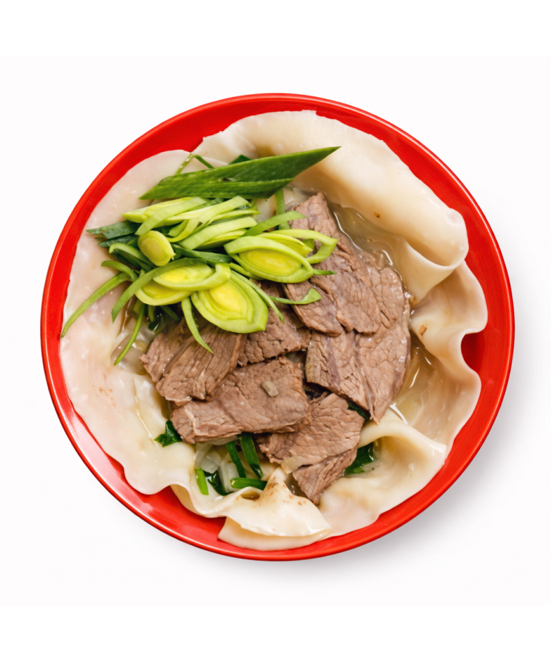 Бульон говяжий, отварная плоская лапша, мякоть говядины, лук репчатый, специи, зелень