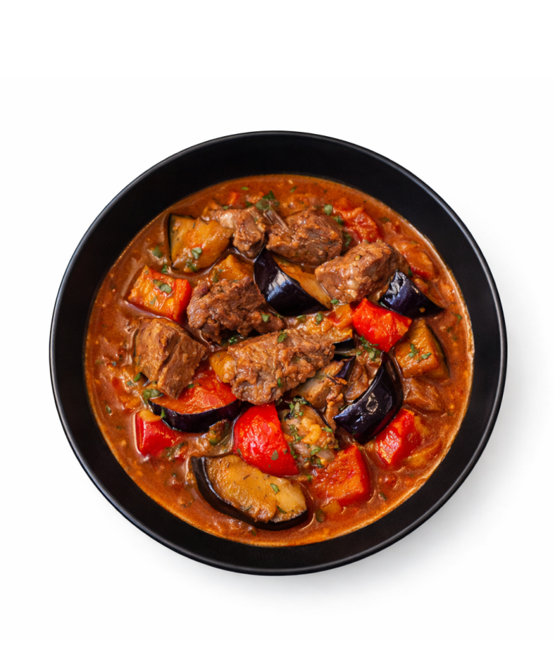 Баклажаны тушеные с бараниной, болгарским перцем и специями, подается в соке с зеленью