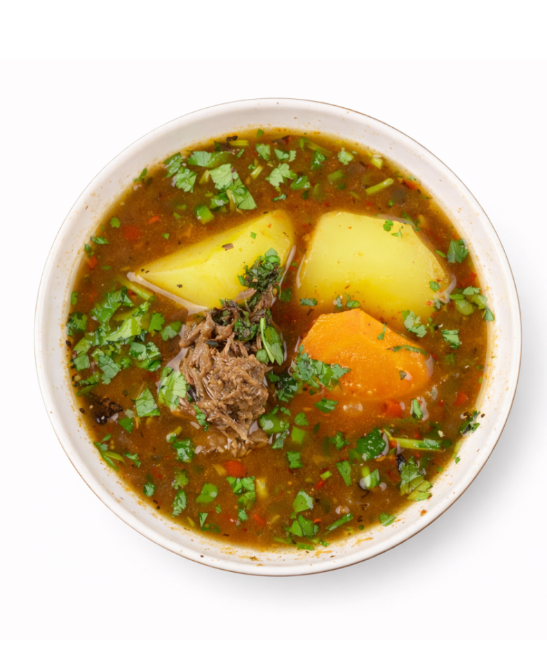 Суп на бараньем бульоне, отварные бараньи ребра, картофель, морковь, болгарский перец, лук, зелень, специи