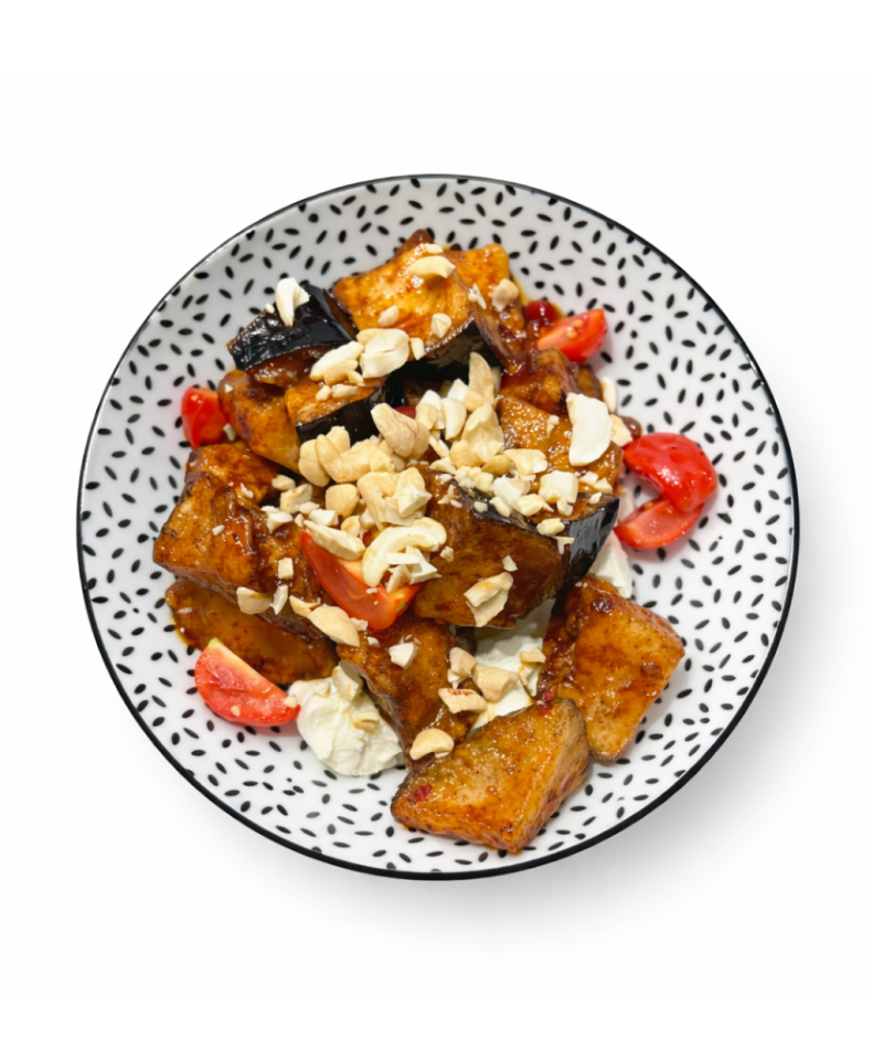 Баклажаны, соус чили сладкий, крем из рикотты, микро зелень