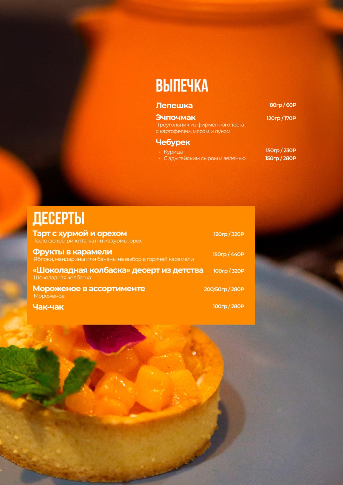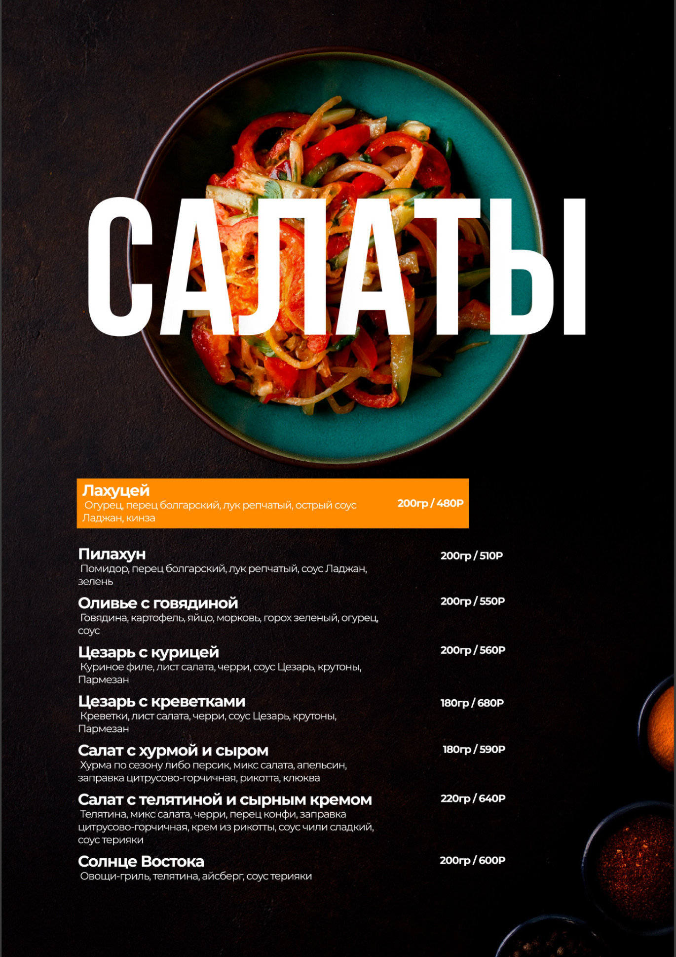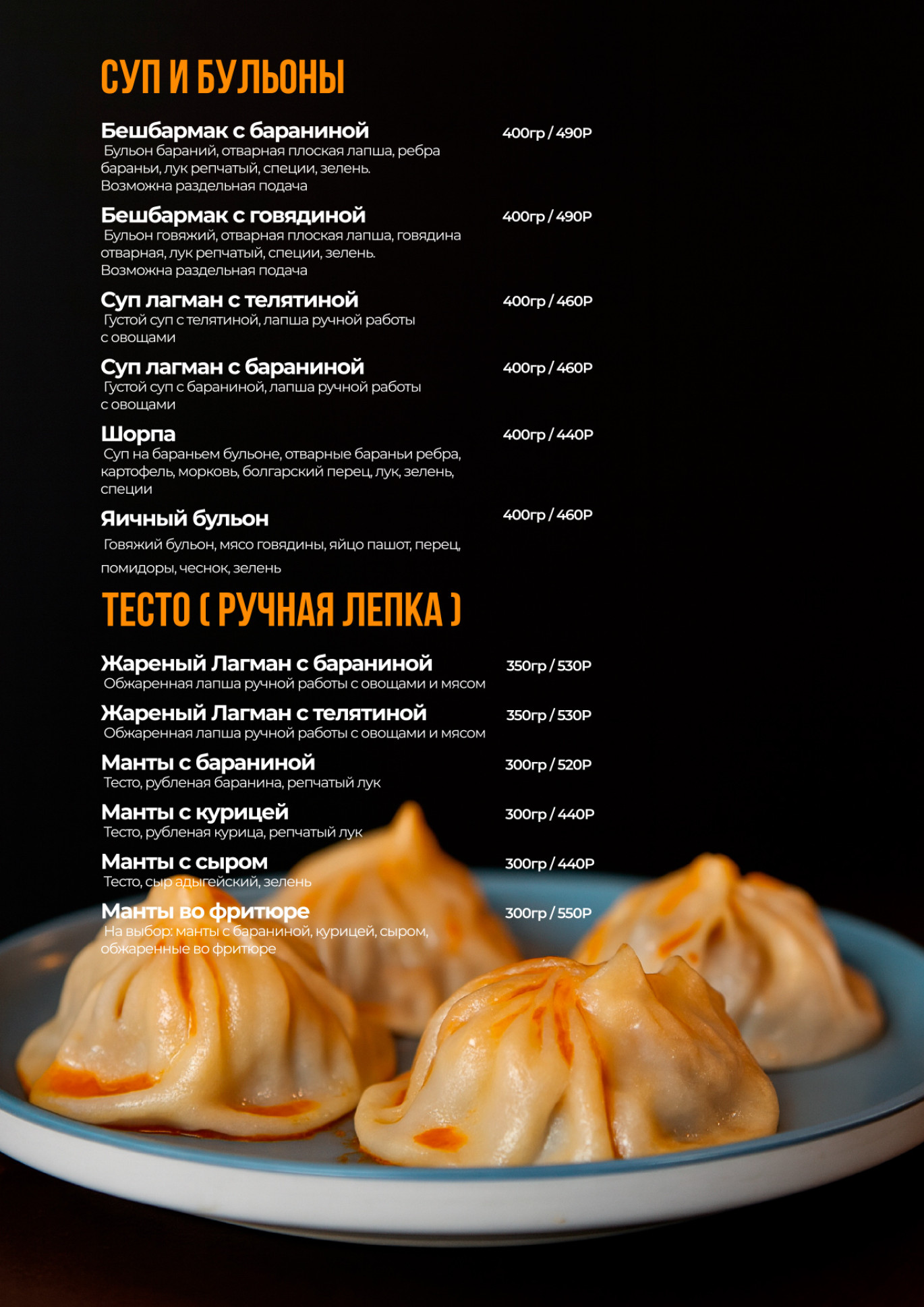 В нашем меню представлены такие блюда, как салат Пилахун, битые огурцы с кунжутом, капуста Ким Чи, Том Кха Ям, Лагман с телятиной или бараниной, а также множество других деликатесов. Попробуйте нашу кухню и откройте для себя новые вкусы!